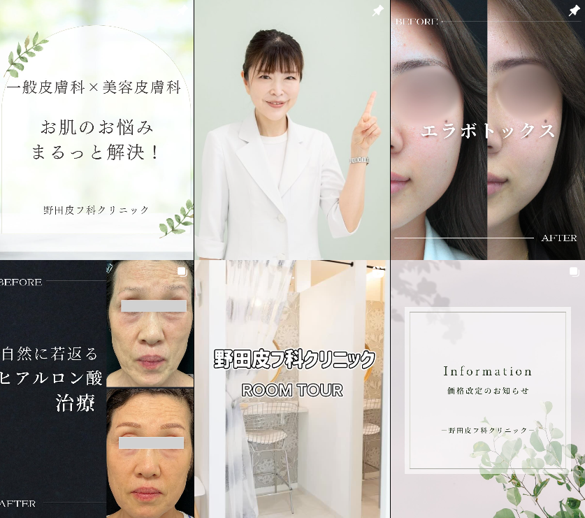 皮フ科クリニックでも、施術のビフォーアフターが写真で見ることができると、信頼に繋がります。野田皮フ科クリニックのInstagramでは、ビフォーアフターの写真はもちろんのこと、肌管理にまつわる知識なども発信しています。また、キャンペーン情報もInstagramで確認ができ、フォローしてもらうとリピートに繋がる可能性が広がります。